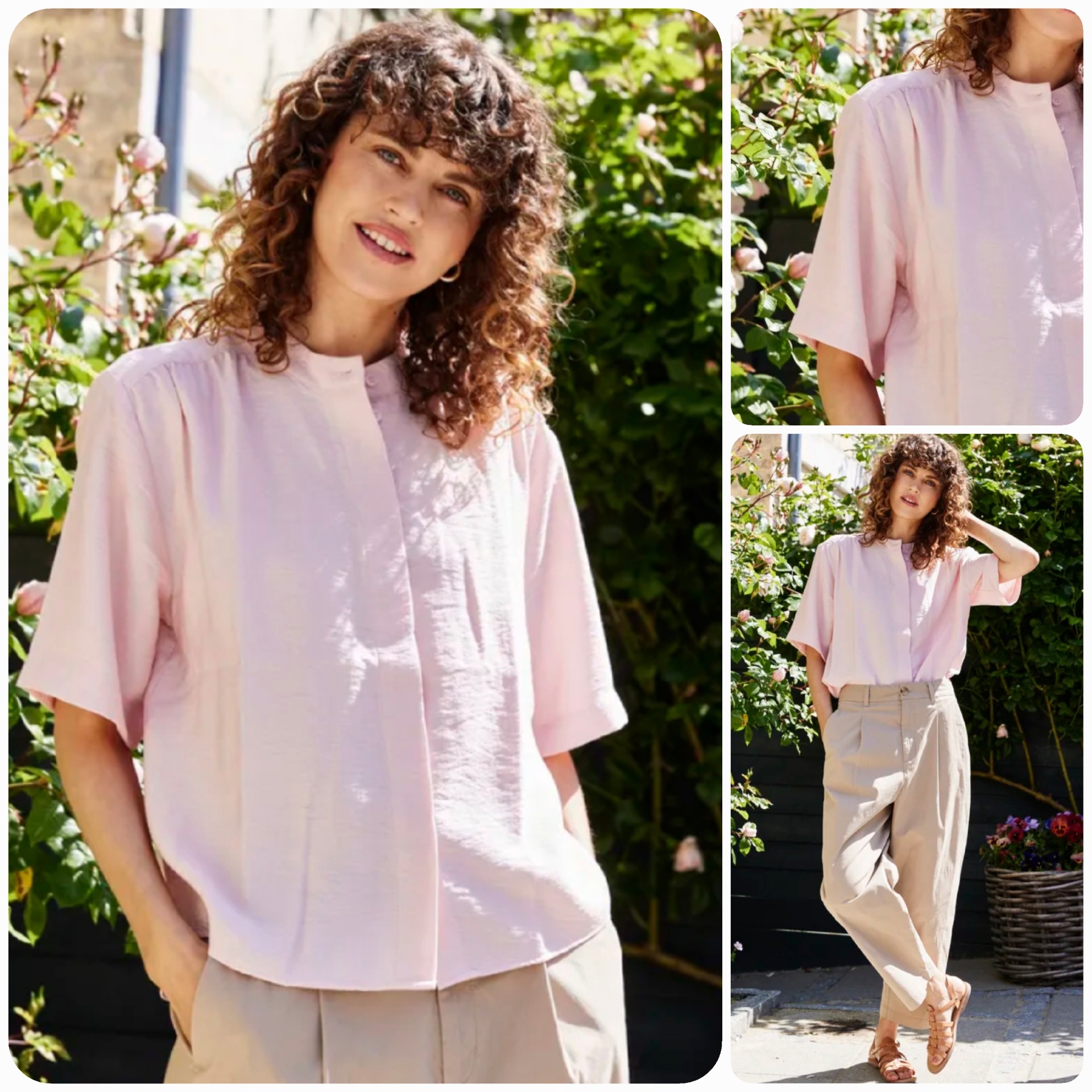 Krátká halenka rovného střihu z jemné strukturované látky. Má kulatý výstřih bez límce, široké krátké rukávy a légu na knoflíky.