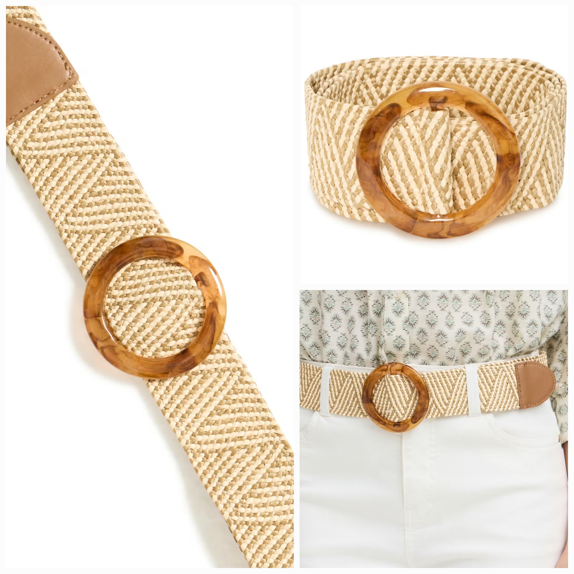 Pružný tkaný opasek se širokou geometrickou texturou, lesklou kruhovou přezkou a zakončením z imitace kůže v tónované barvě. Tento výrazný doplněk dodá každému vzhledu výrazný a moderní nádech.