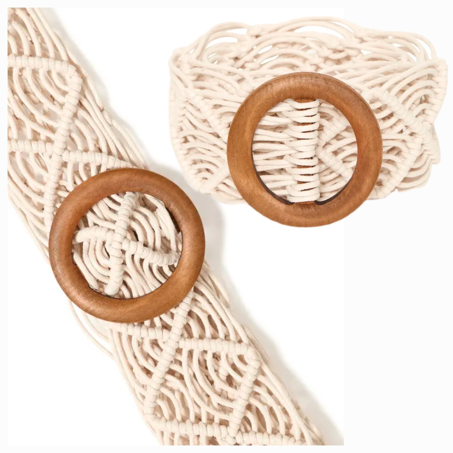Tkaný opasek s výrazným pletením a širokou dřevěnou kruhovou přezkou. Tento výrazný doplněk dodá každému vzhledu výrazný a moderní nádech.